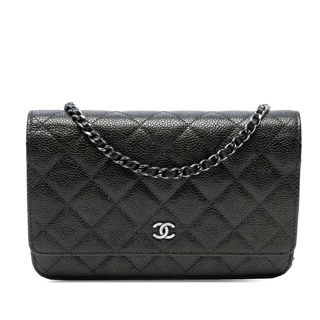 This wallet on chain features a quilted caviar leather body, a leather woven chain link shoulder strap, a front flap with magnetic snap closure, an interior zip compartment, and interior slip pockets.