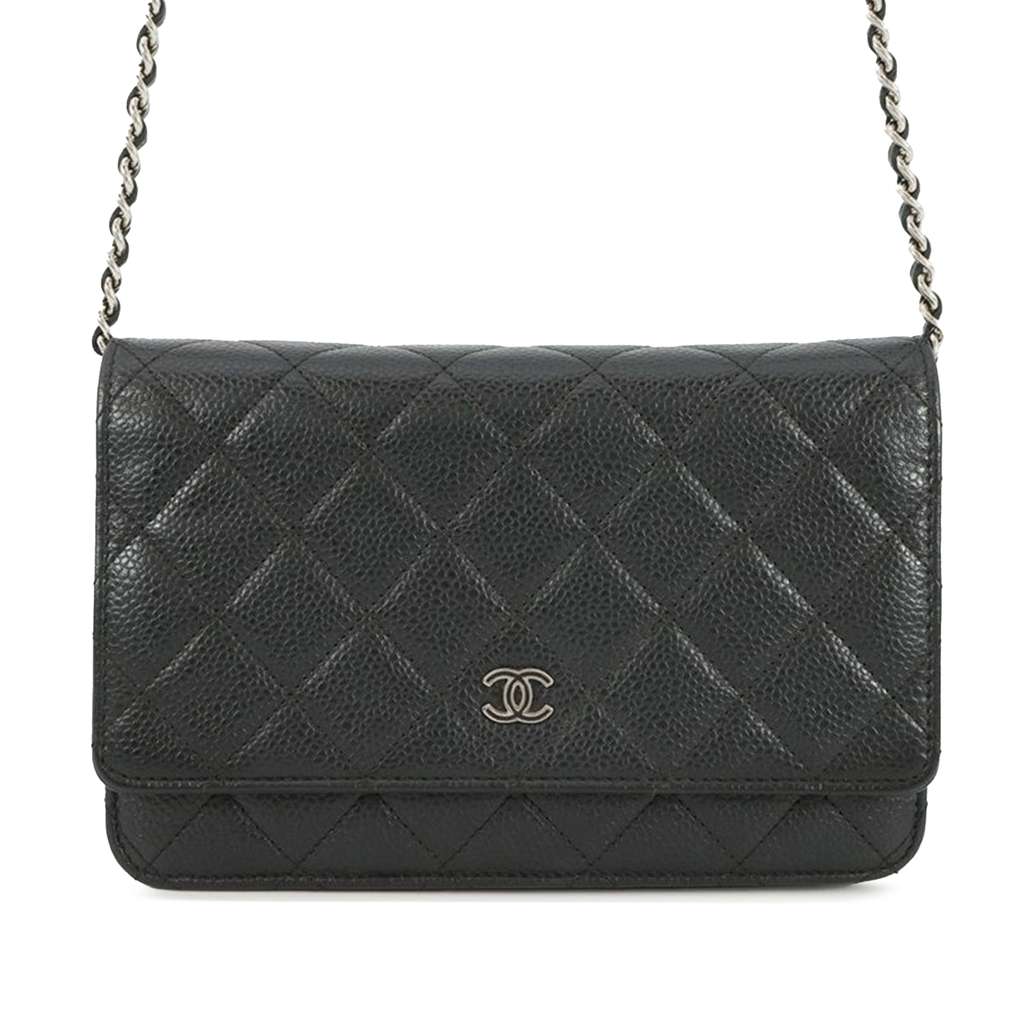 This wallet on chain features a quilted caviar leather body, a silver-tone woven chain strap, a front flap with magnetic snap closure, a top zip closure, and interior slip pockets.