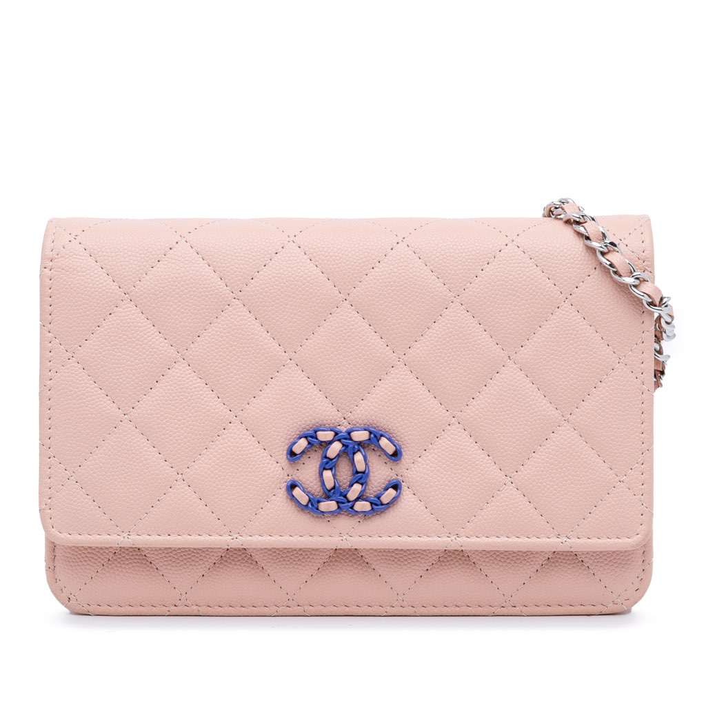 This crossbody features a quilted caviar leather body, a leather woven chain strap, a front flap with magnetic snap closure, an exterior back slip pocket, and interior zip and slip pockets.