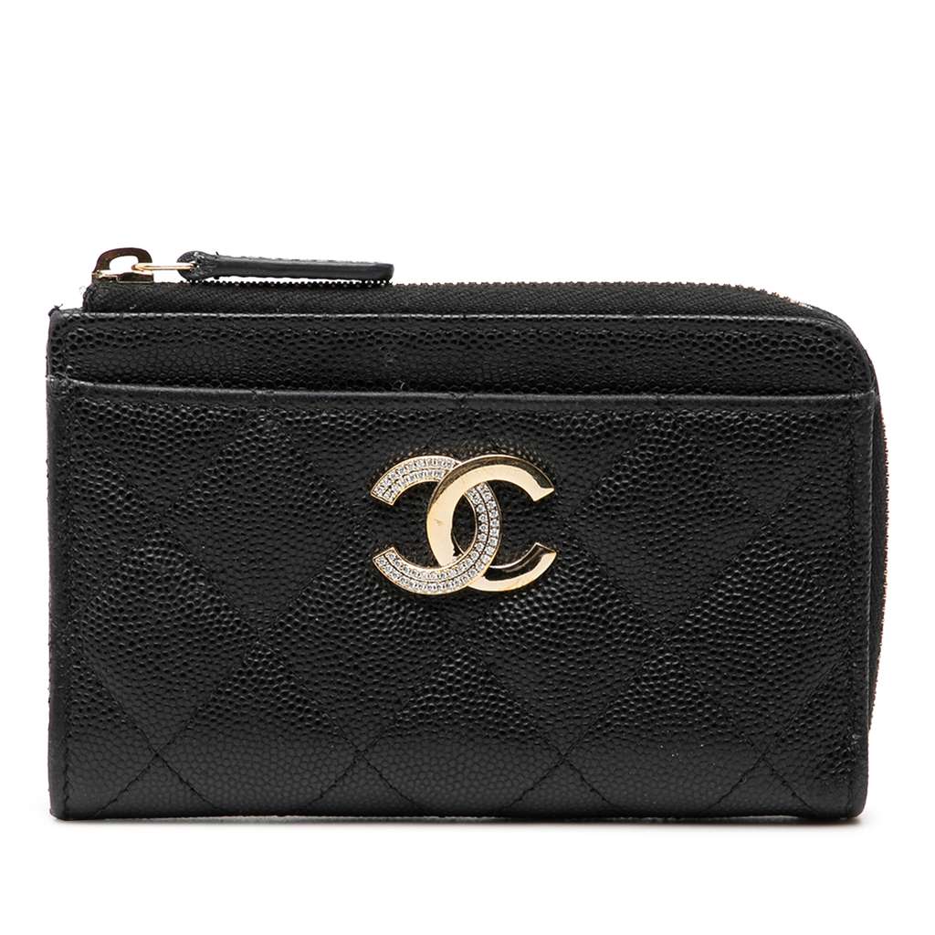 This card holder features a quilted lambskin leather body, a zip around closure, and exterior card slots.