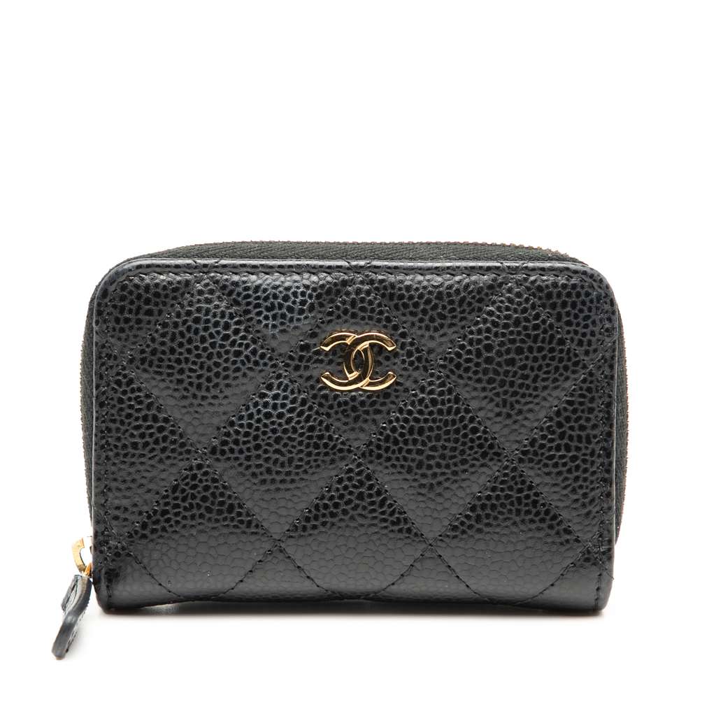 This coin purse features a quilted caviar leather body, a zip closure, an exterior back slip pocket, and interior open compartments.