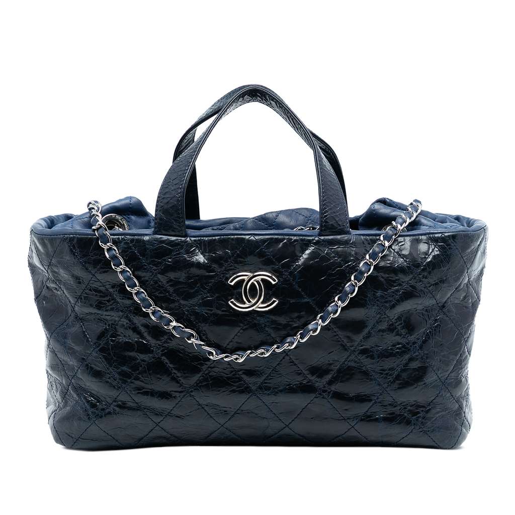 This satchel features a quilted glazed calfskin leather body, flat leather handles, leather woven chain link straps, a top flap with CC turn lock closure, and interior zip and slip pockets.