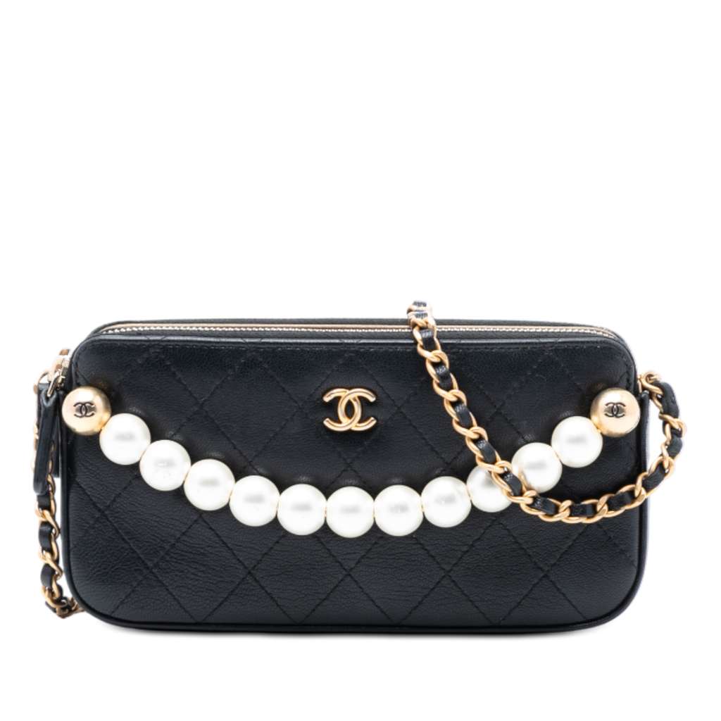This satchel features a quilted goatskin body, a faux pearl chain handle, a leather-woven chain shoulder strap, a center open compartment, two zip around compartments, and interior slip pockets.