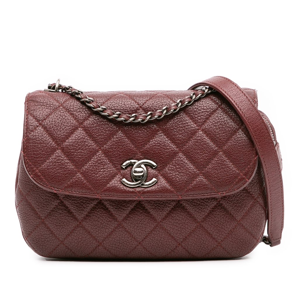 This crossbody features a quilted goatskin body, a leather-woven chain link with shoulder pad, a front flap with CC turn lock closure, and interior zip compartments.