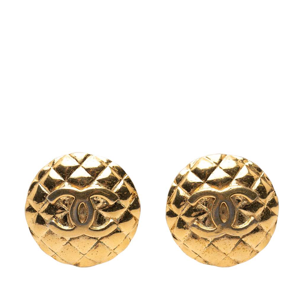 These earrings feature quilted gold plated metal bodies and clip on closures.