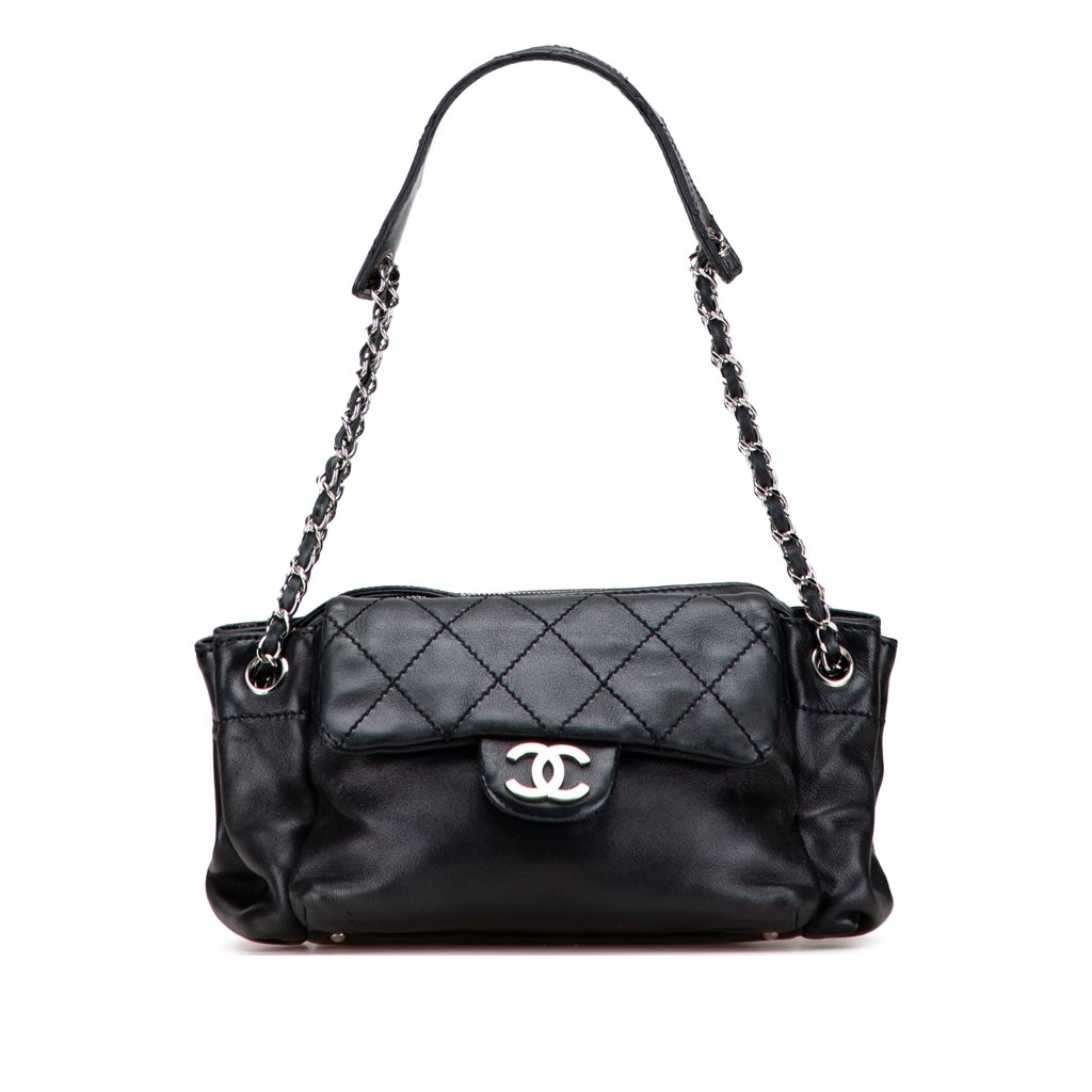 This shoulder bag features a lambskin leather body, a leather woven chain link strap with leather shoulder guard, an exterior back slip pocket, an exterior front flap pocket with snap button closure, an interior zip pocket.