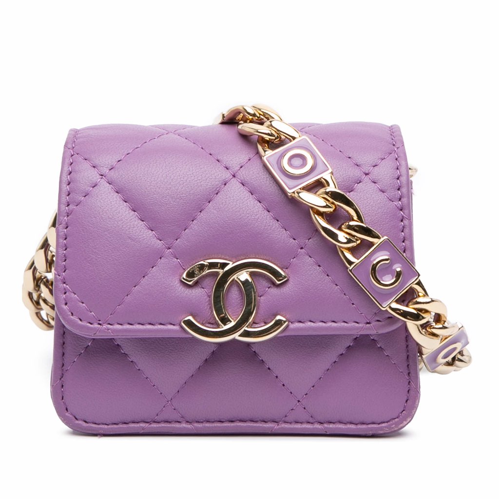 This crossbody bag features a quilted leather body, a curb chain link strap with enamel Coco letter charm details, and a flap with snap button closure.
