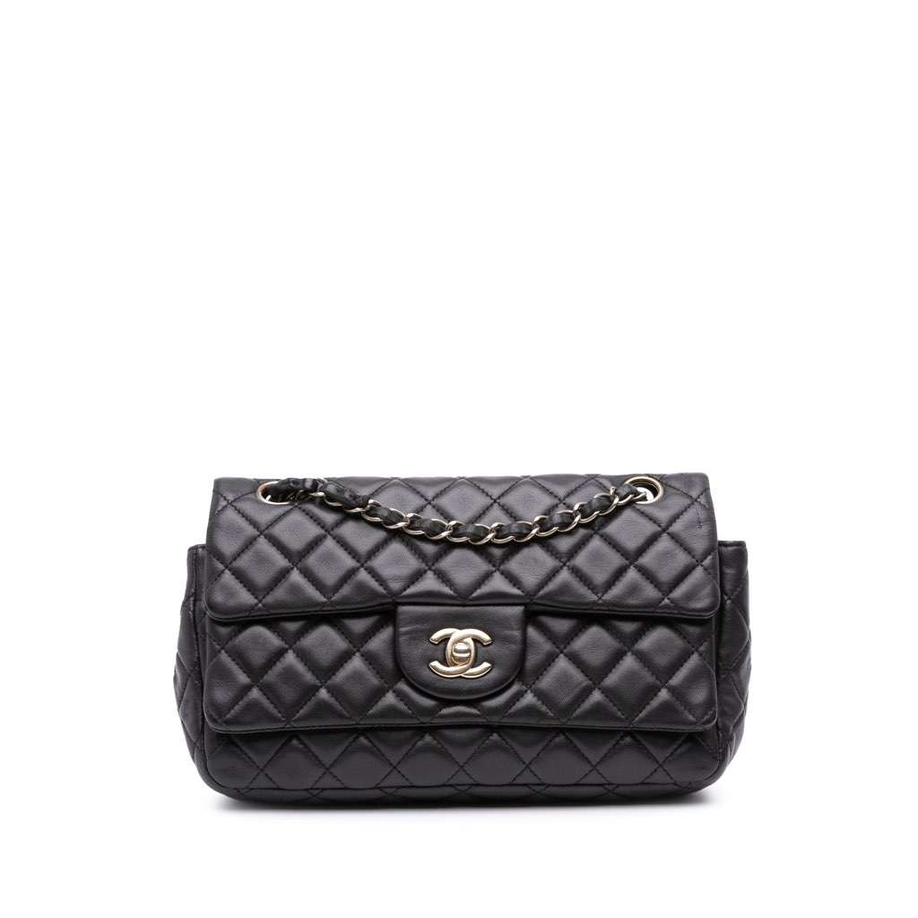 This shoulder bag features a quilted lambskin body, leather woven chain link straps, double front flaps with interlocking Cs and a twist lock closure, an exterior back slip pocket, and interior slip pockets.