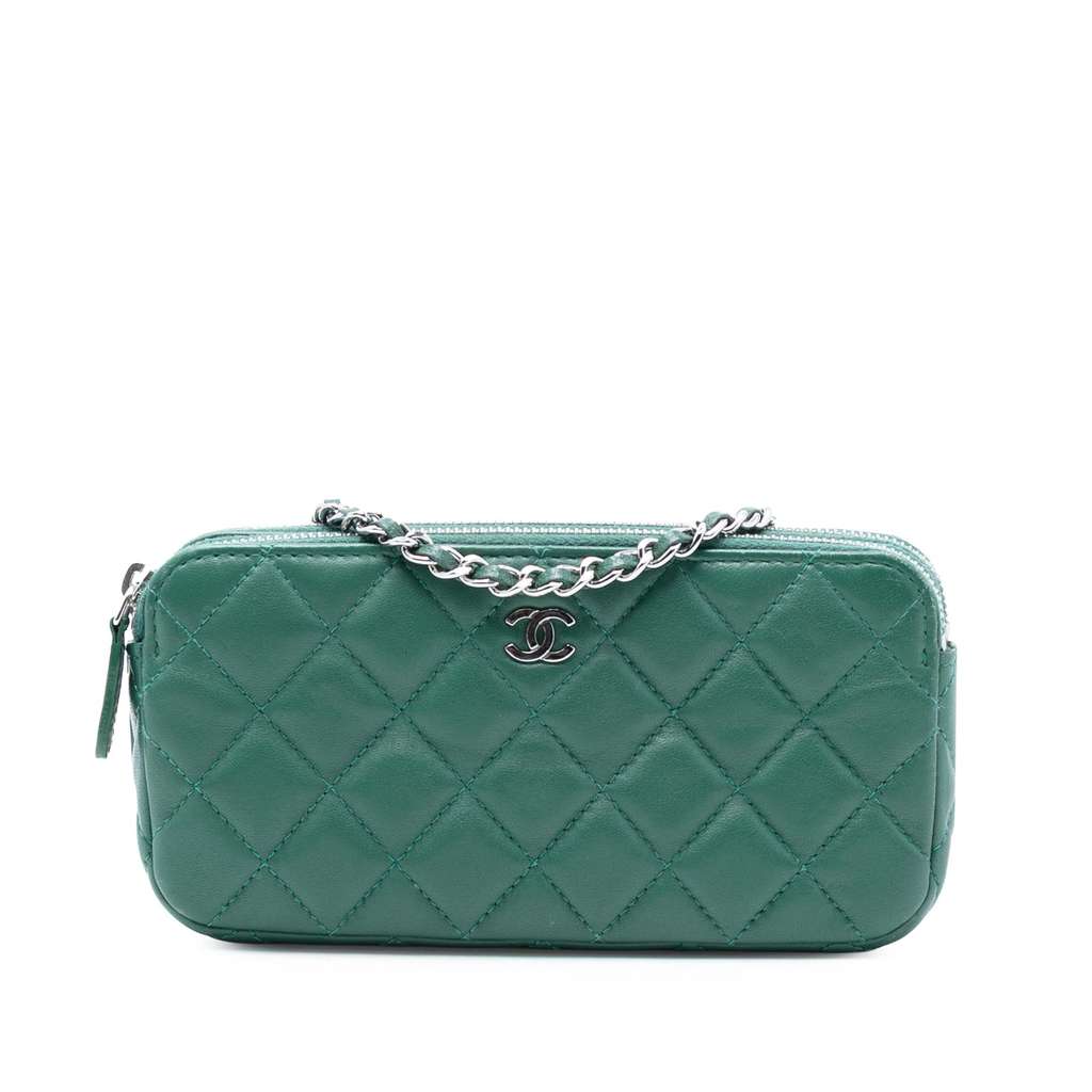 This crossbody features a quilted lambskin leather body, a leather woven chain strap, top zip closures, and interior slip pockets.