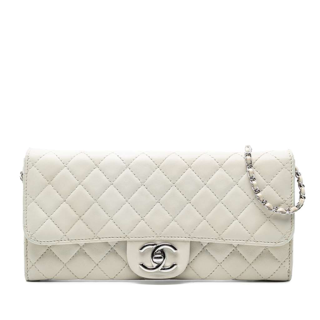 This flap features a quilted lambskin body, leather woven chain handles, single front flaps with interlocking Cs and a twist lock closure, a back exterior slip pocket, and interior zip and slip pockets