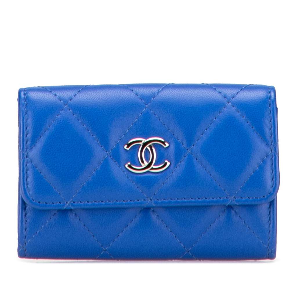 This card holder features a quilted lambskin leather body, a front flap with magnetic snap closure, and interior slip pockets.