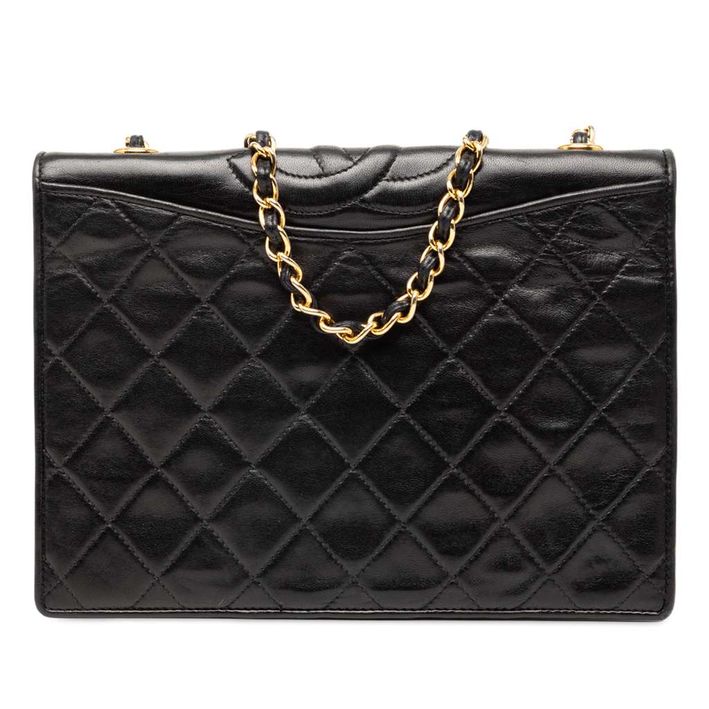 This crossbody bag features a quilted lambskin leather body, a leather-woven chain strap, a front flap with magnetic snap closure, and an interior zip pocket.