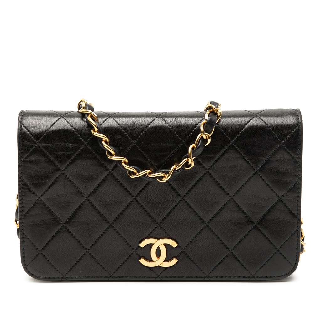 This crossbody bag features a quilted lambskin leather body, a leather woven chain strap, a front flap with push lock closure, and an interior slip pocket.