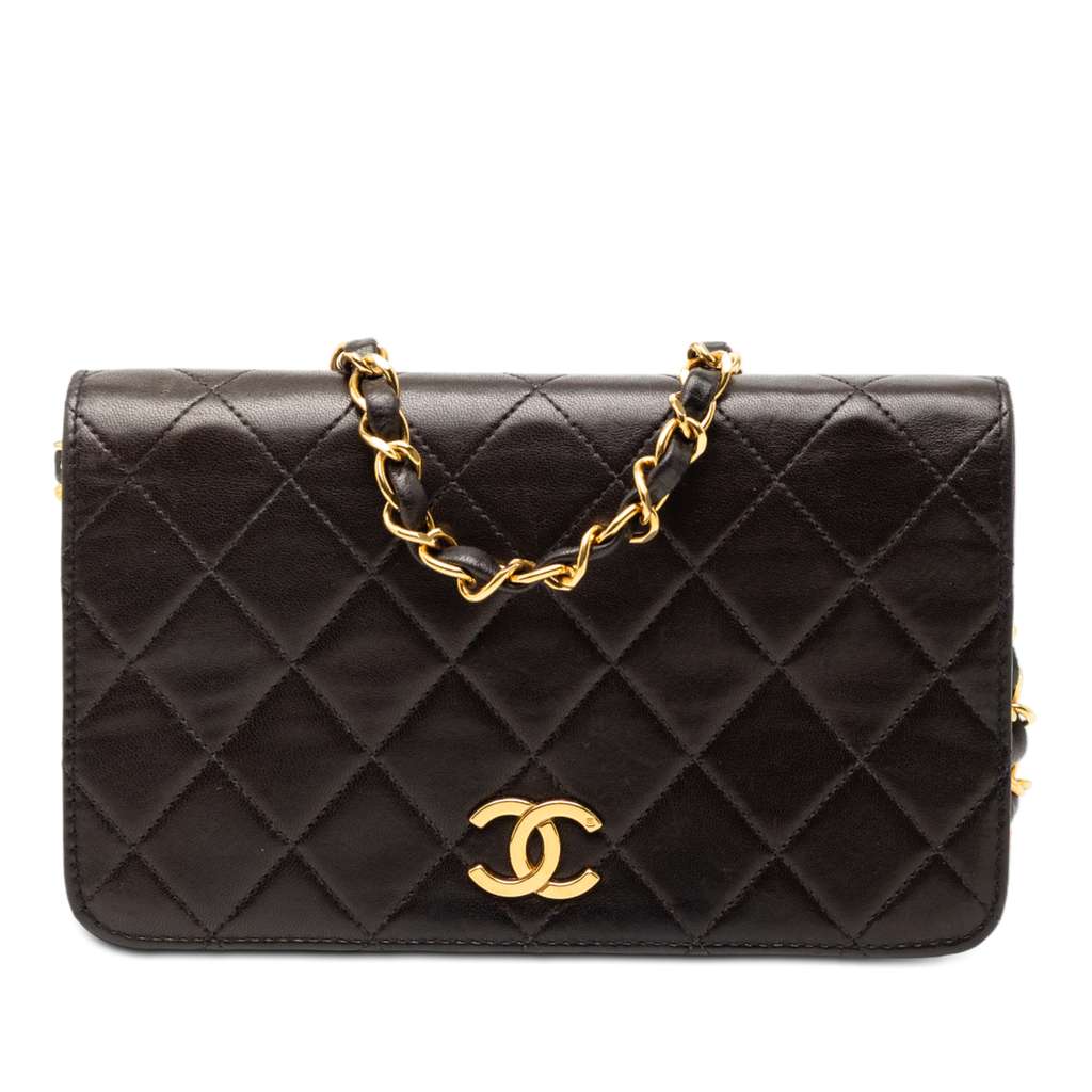This crossbody bag features a quilted lambskin leather body, a leather woven chain link strap, a front flap with push lock closure, and an interior slip pocket.