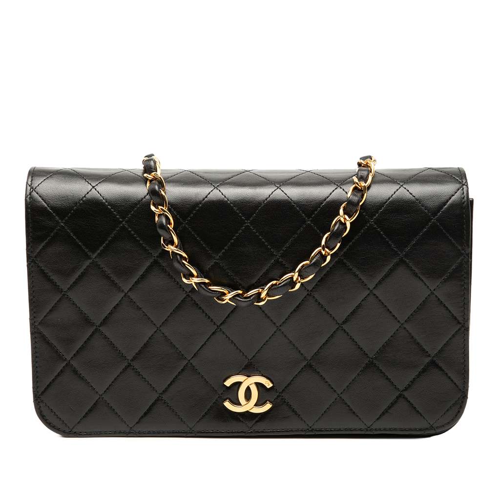 This crossbody bag features a quilted lambskin leather body, a leather woven chain strap, a front flap with magnetic snap closure, and an interior zip pocket.