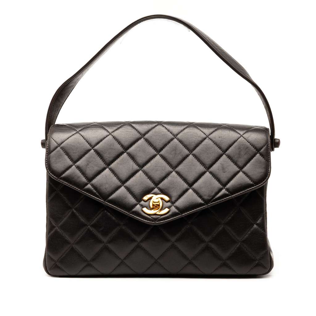This handbag features a quilted lambskin leather body, a flat leather handle, a front flap with twist lock closure, and interior zip and slip pockets.