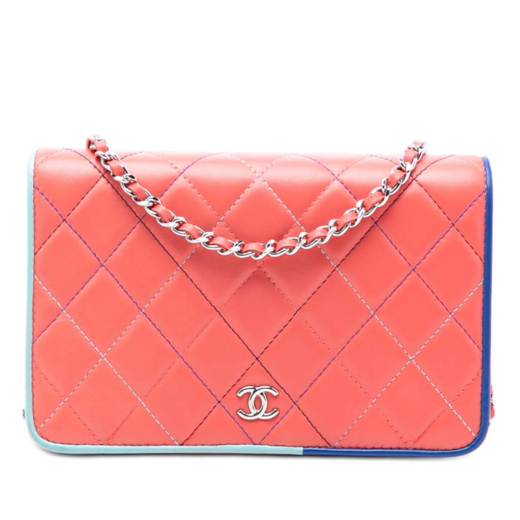 This crossbody bag features a quilted lambskin leather body, a leather woven chain-link strap, a front flap with a magnetic snap button closure, and interior zip and slip pockets.