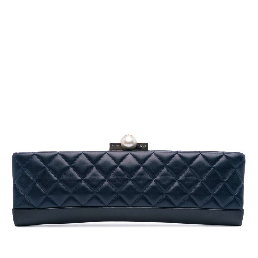 This clutch bag features a quilted lambskin leather body, a top clasp closure with a pearl accent, and an interior slip pocket