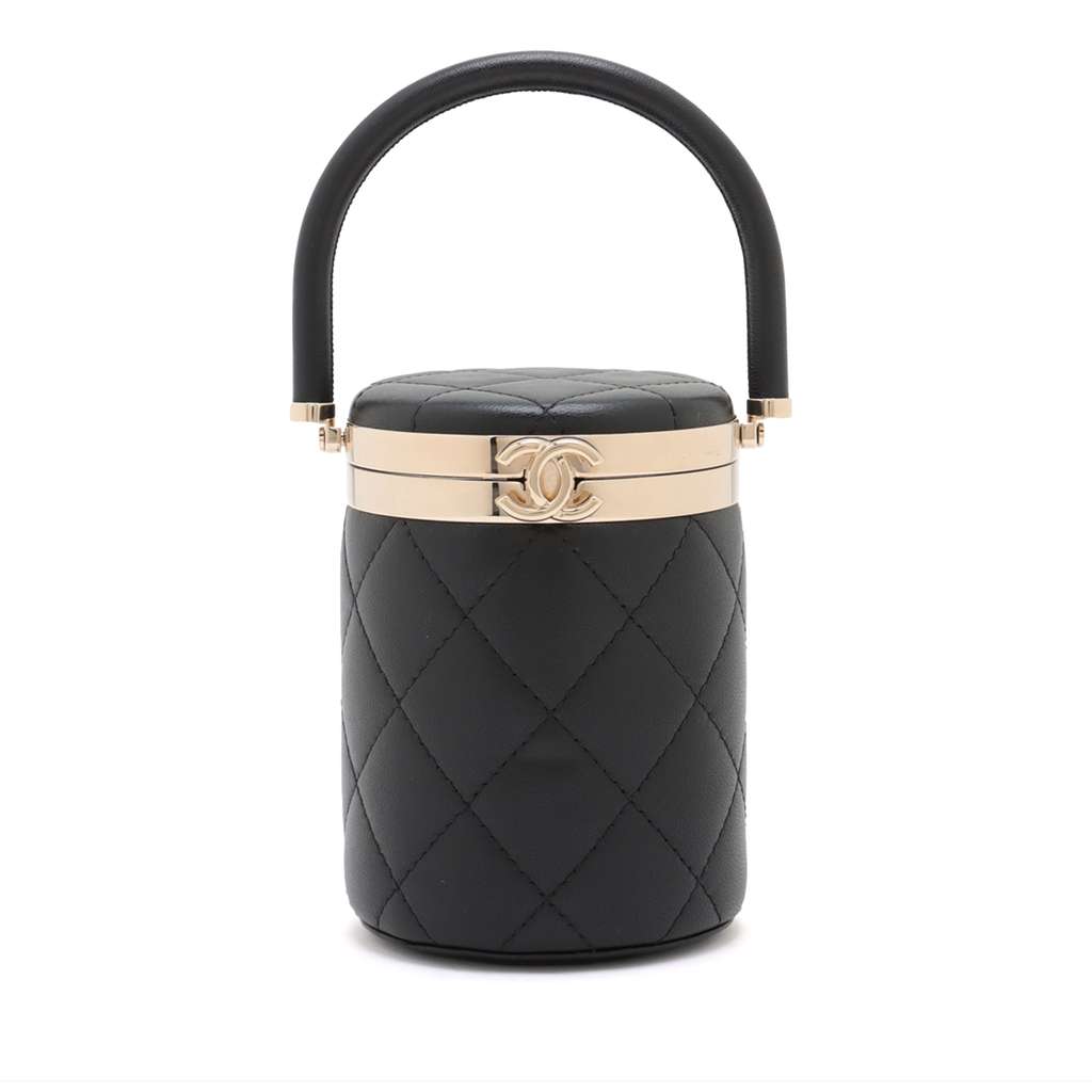 This vanity bag features a quilted lambskin leather body, a rolled handle, a top clasp closure, and an interior mirror.