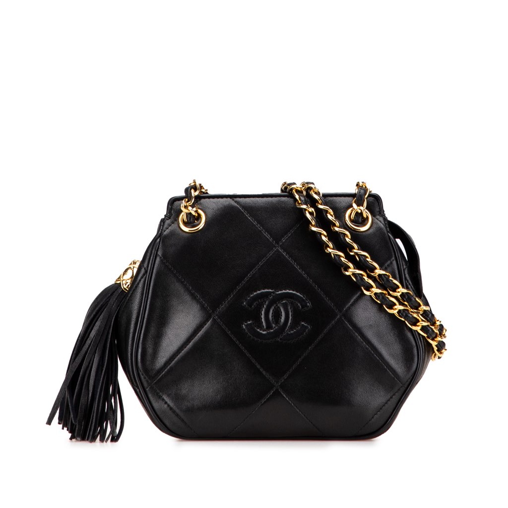This crossbody bag features a lambskin leather body with tassel detail, leather woven chain link straps, a top zip closure, and an interior zip pocket.
