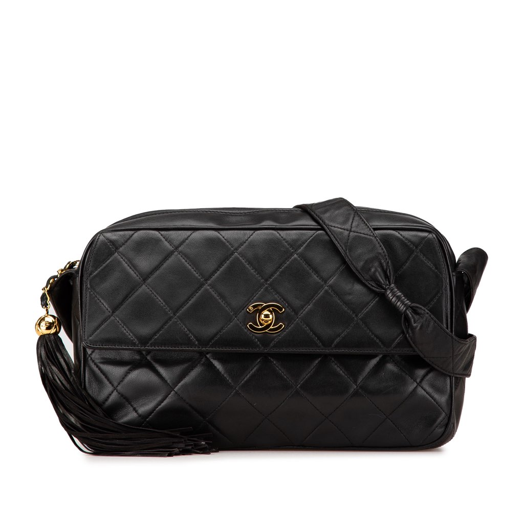 This crossbody bag features a quilted lambskin leather body with tassel detail, a flat leather strap, a top zip closure, an exterior flap pocket with CC turn-lock closure, and interior zip and slip pockets.
