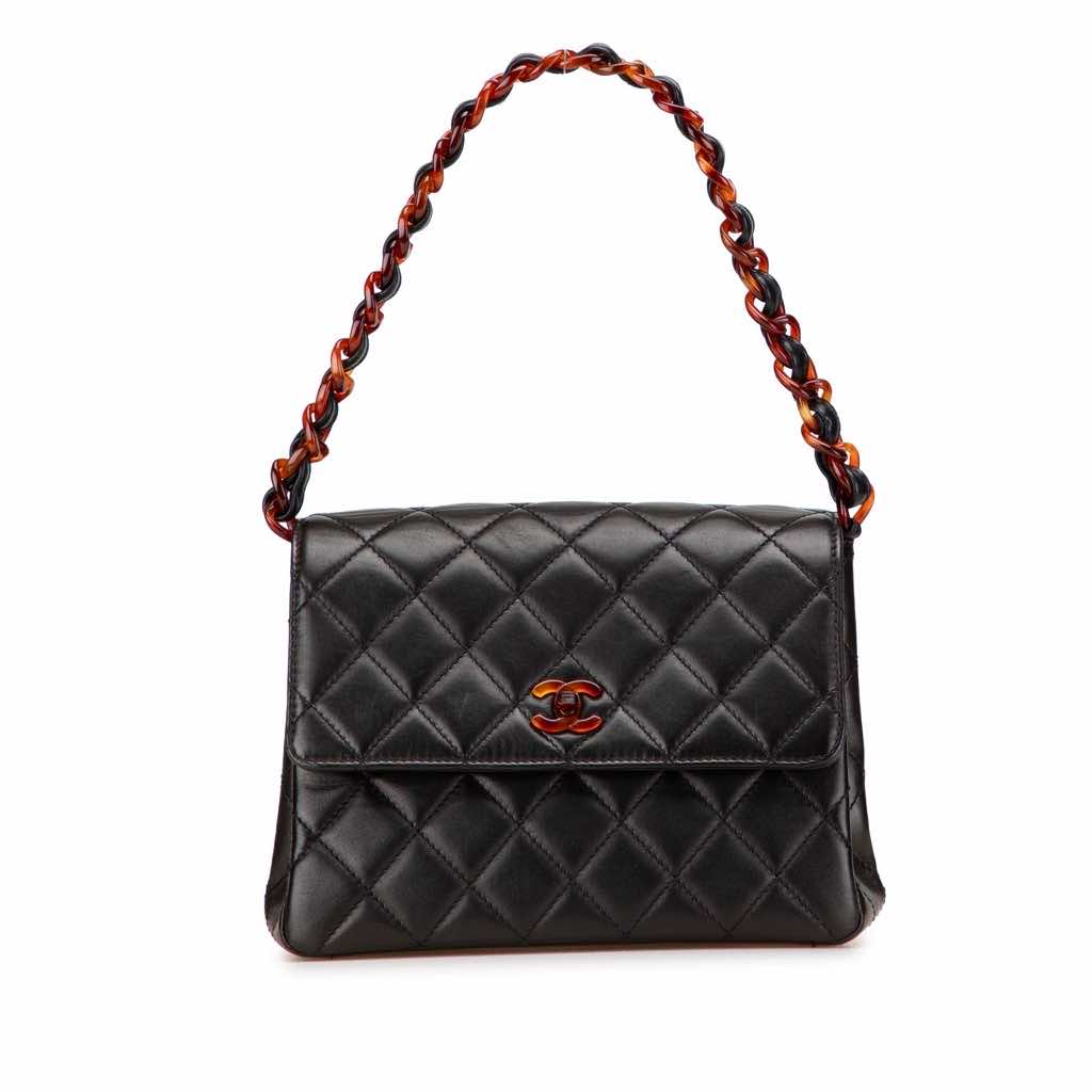 This shoulder bag features a quilted lambskin body, a leather woven tortoise shell acrylic chain shoulder straps, a front flap with interlocking Cs and a twist lock closure, an exterior back slip pocket, and interior zip and slip pockets.