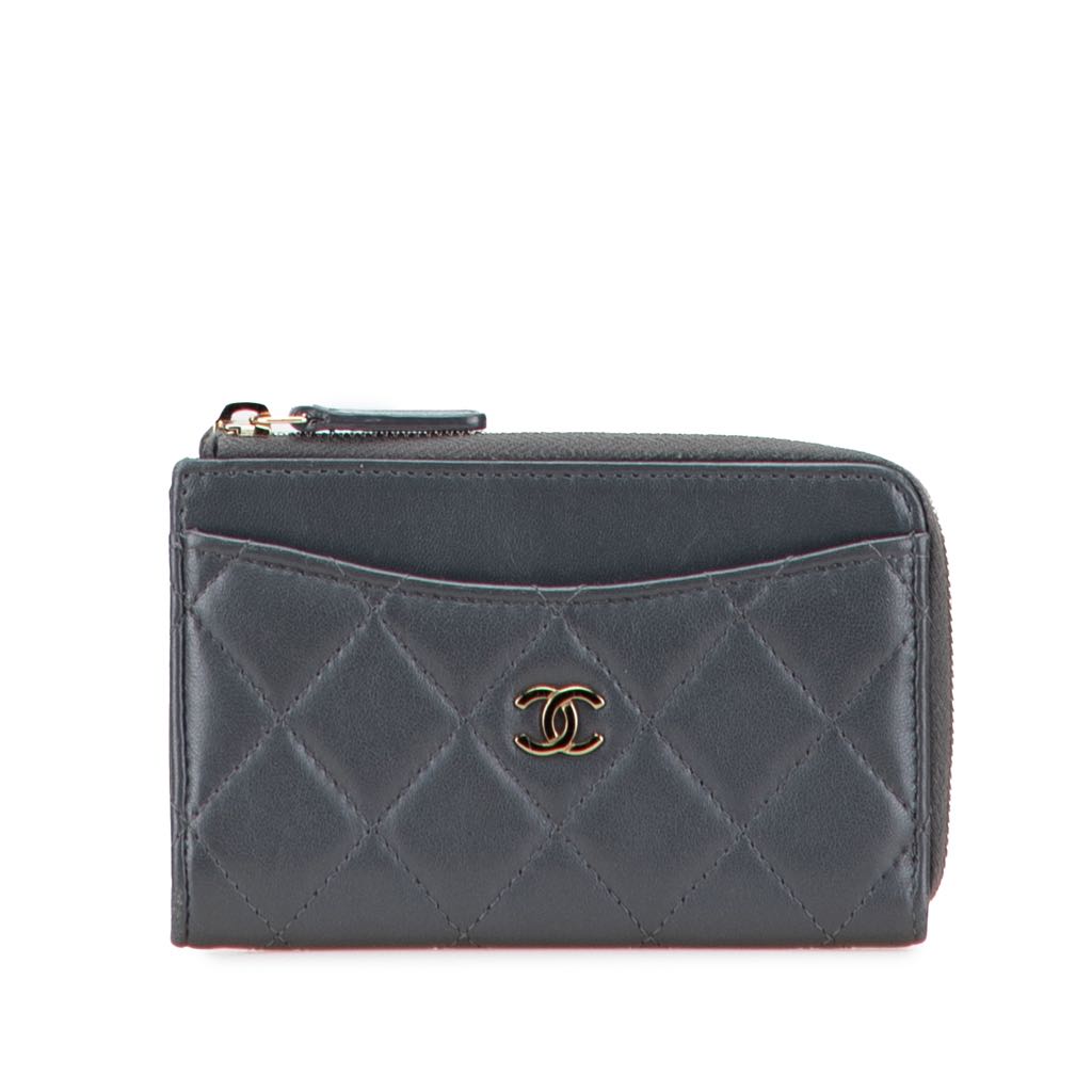 This card holder features a quilted lambskin leather body, a top zip closure, and exterior card slots.