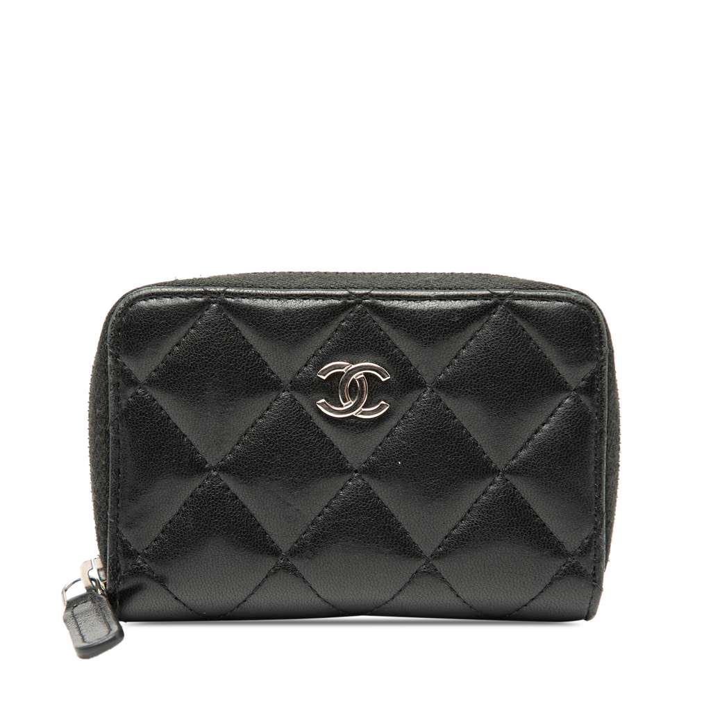 This coin purse features a quilted leather body, a zip-around closure, an exterior back slip pocket, and interior slip compartments.