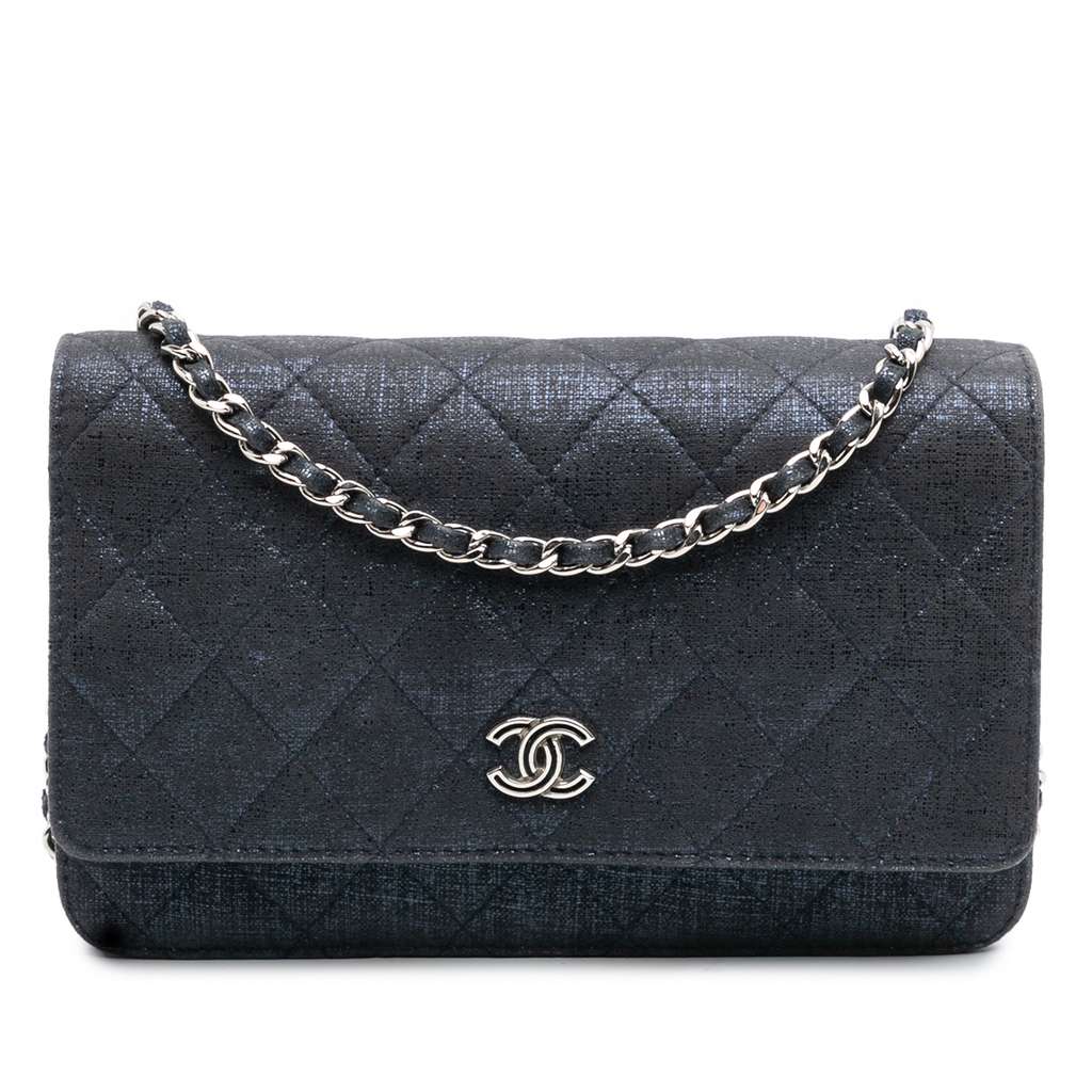 This wallet on chain features a metallic fabric body, a chain-link strap, a flap with snap closure, and interior zip and slip pockets.