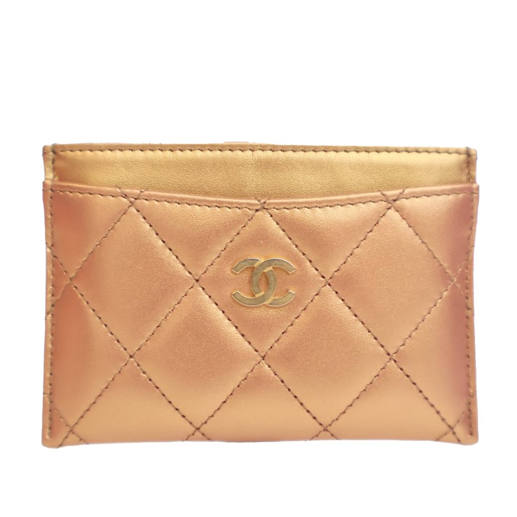 This card holder features a quilted lambskin leather body, an open top, and exterior card slots.