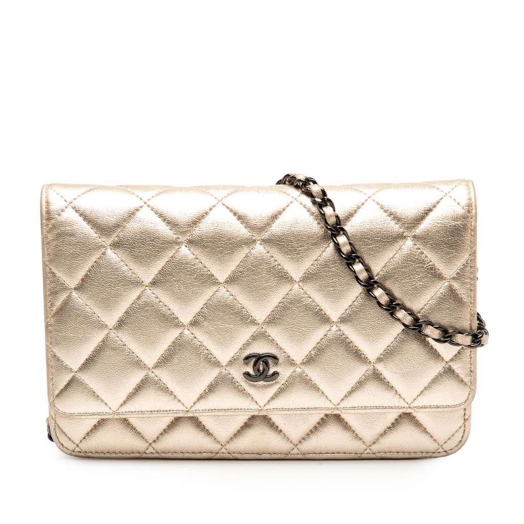 This wallet on chain features a quilted lambskin leather body, a leather woven chain strap, a front flap with magnetic closure, an exterior back slip pocket, and interior zip and slip pockets.