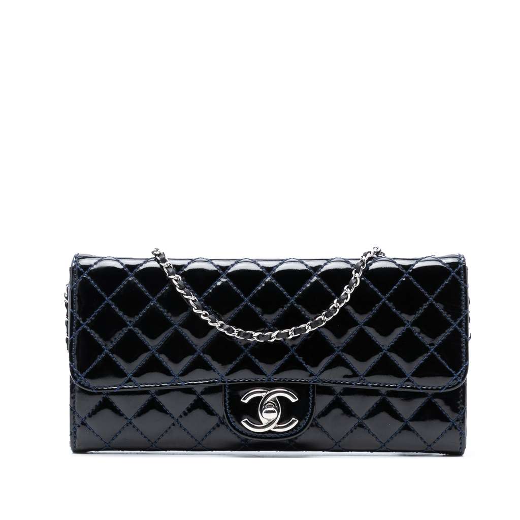 This shoulder bag features a quilted patent leather body, a leather woven chain link strap, a front flap with turn lock closure, and interior zip and slip pockets.