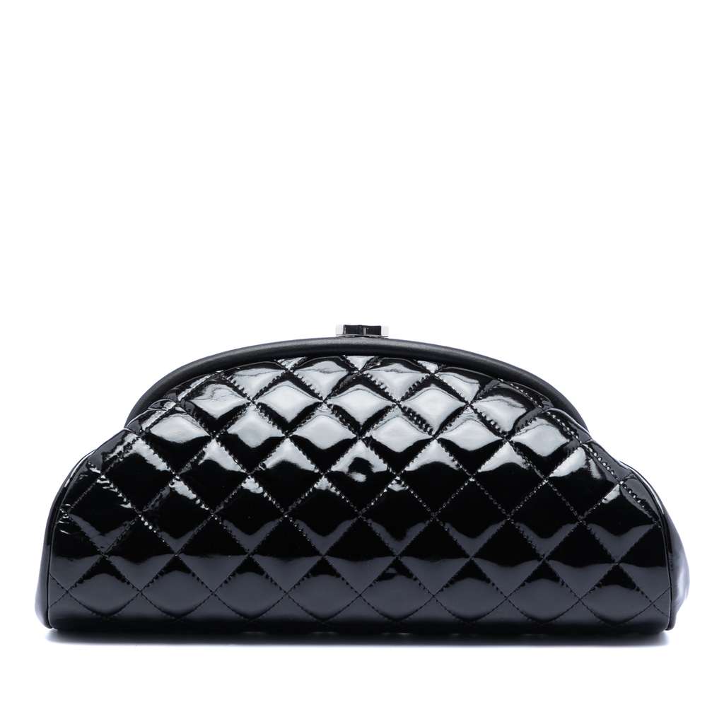 This clutch bag features a quilted patent leather body, a top kiss lock closure, and an interior zip pocket.