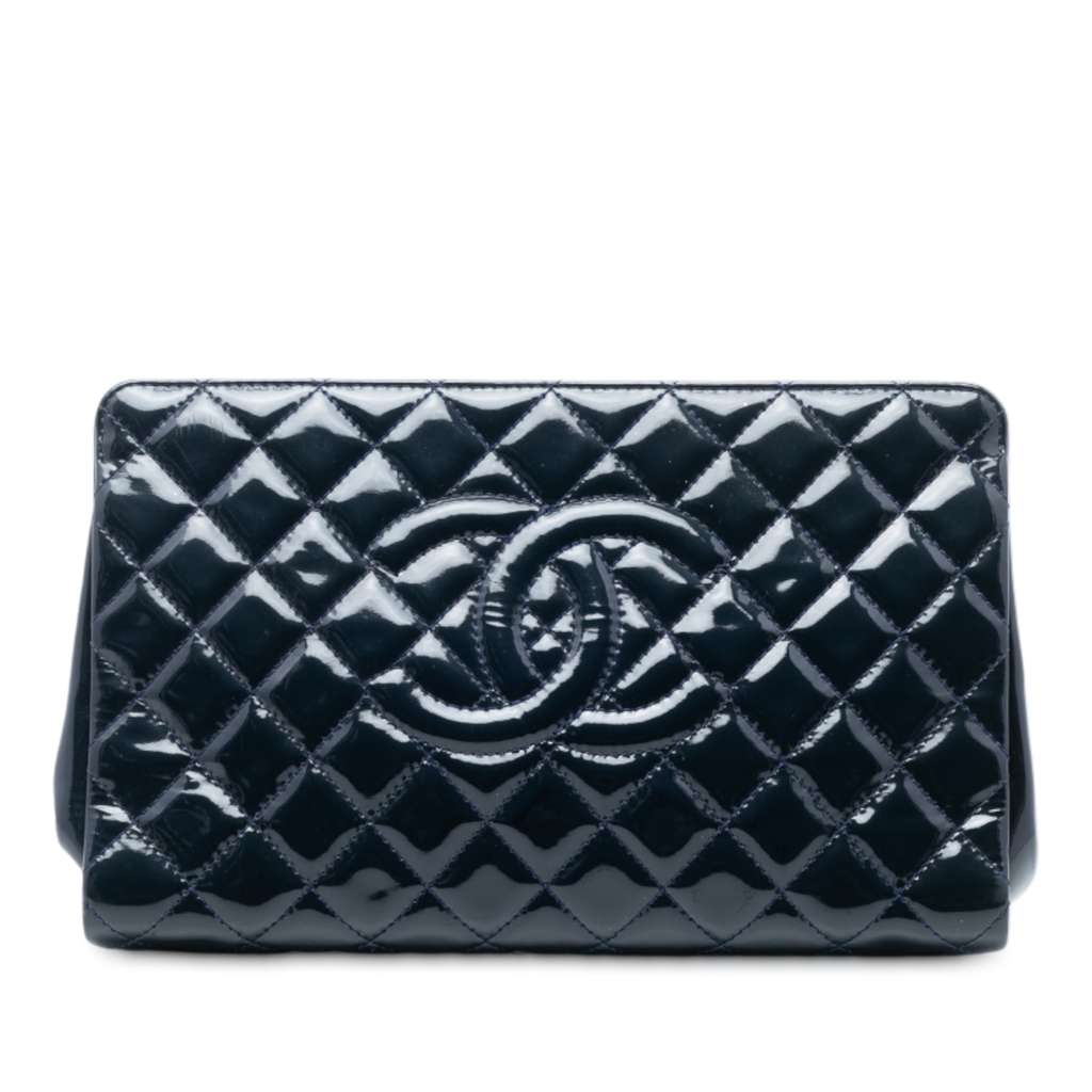 This clutch bag features a quilted patent leather body, open top with magnetic snap closure, and an interior zip pocket.