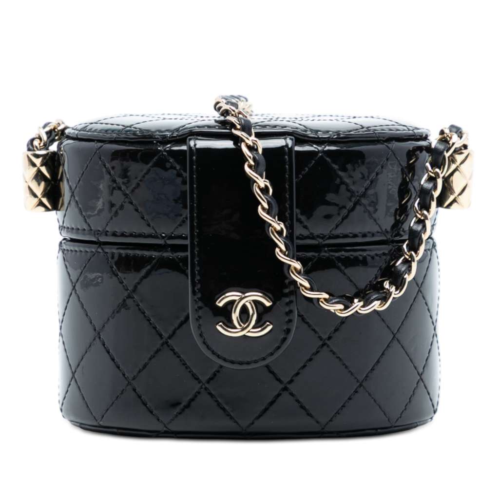 This satchel features a quilted patent leather body, a leather woven chain strap, a top zip-around closure, an interior mirror, and interior slip pockets.