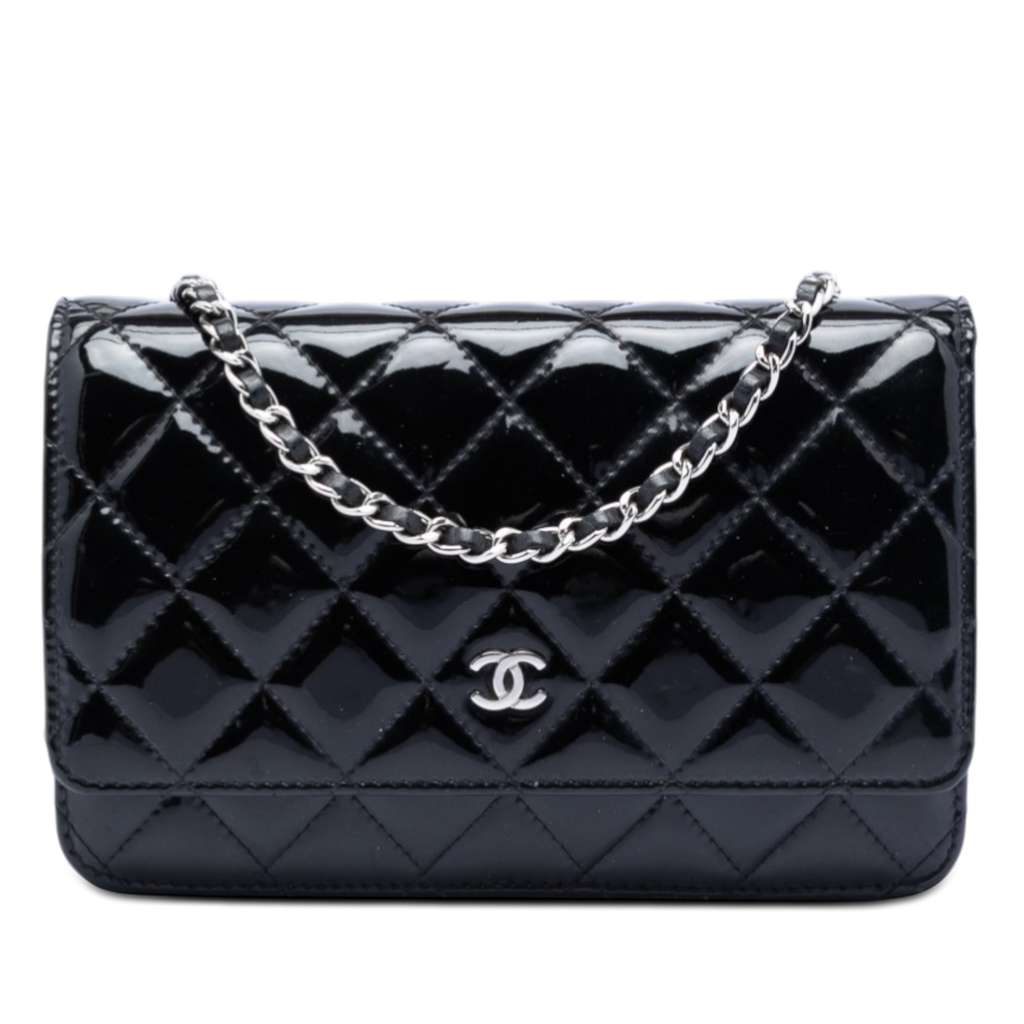 Chanel CC Quilted Patent Wallet On Chain Black Mini Leather