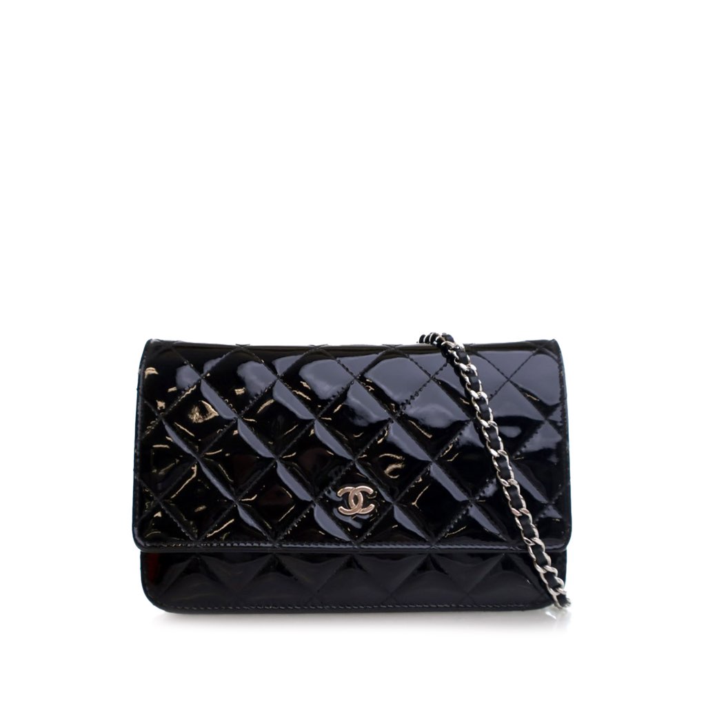 This wallet on chain features a quilted patent leather body, a leather woven chain link strap, a front flap with snap closure, an interior zip compartment, and interior zip and slip pockets.
