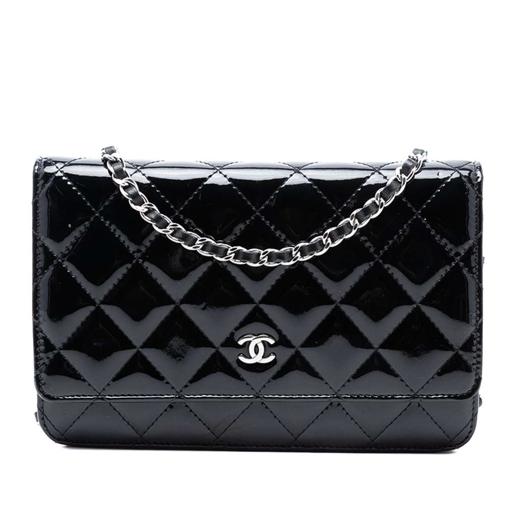 This wallet on chain features a quilted patent leather body, a leather woven chain link strap, a front flap with snap closure, an interior zip compartment, and interior zip and slip pockets.