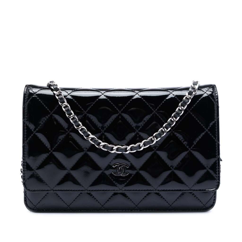 Chanel CC Quilted Patent Wallet On Chain Black Mini Leather