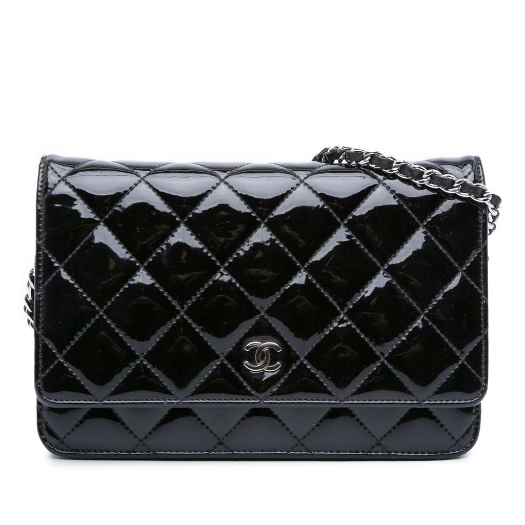 This wallet on chain features a quilted patent leather body, a leather woven chain link strap, a front flap with snap closure, an interior zip compartment, and interior zip and slip pockets.