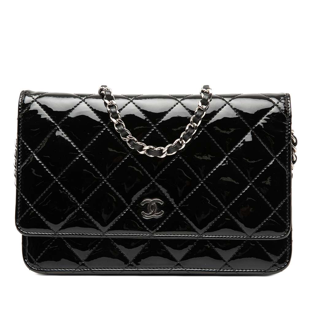 This wallet on chain features a quilted patent leather body, a leather woven chain link strap, a front flap with snap closure, a back exterior slip pocket, and interior zip and slip pockets.