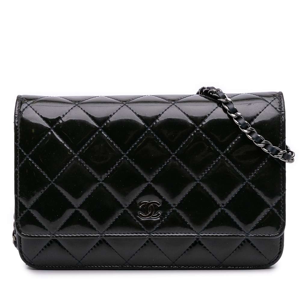 This wallet on chain features a quilted patent leather body, a leather woven chain link strap, a front flap with snap closure, an interior zip compartment, and interior zip and slip pockets.
