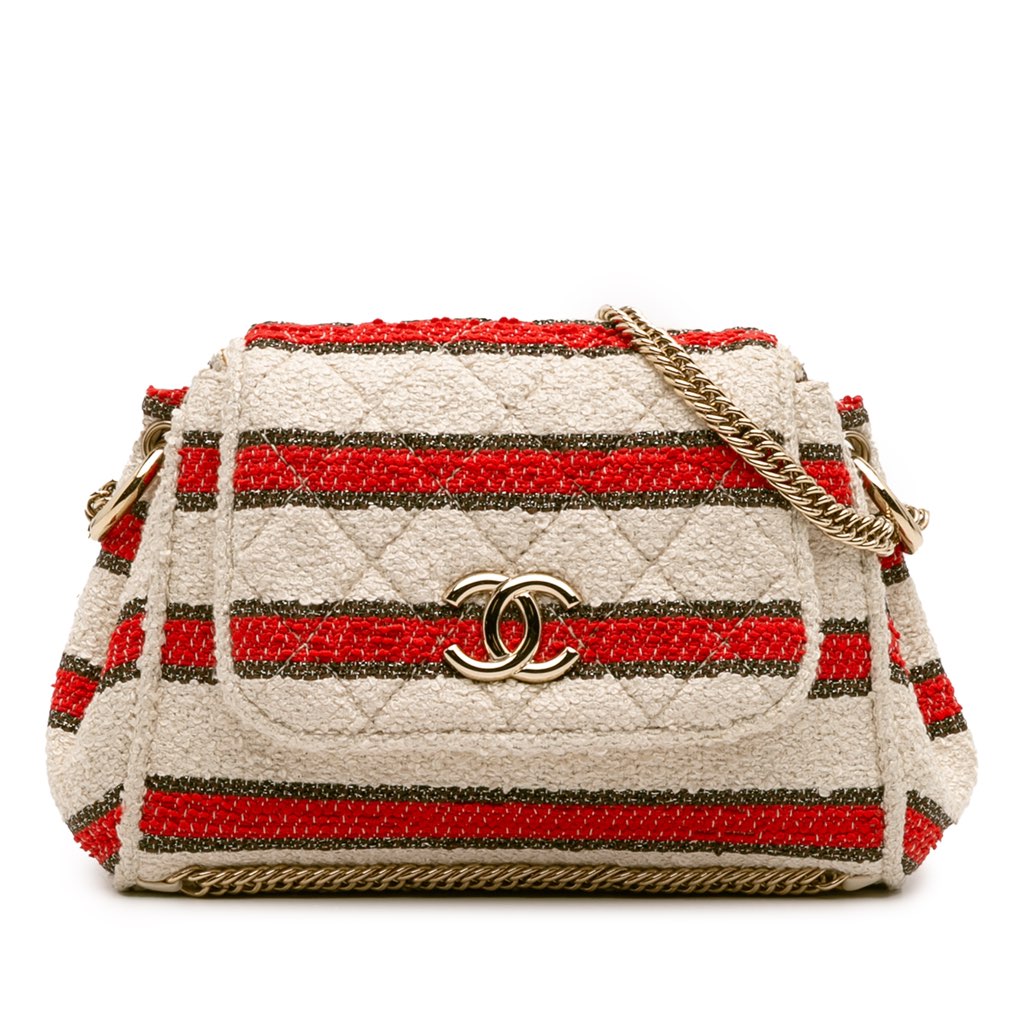 This shoulder bag features a tweed body, a curb chain link strap, a flap with magnetic snap button closure, and an interior zip pocket.