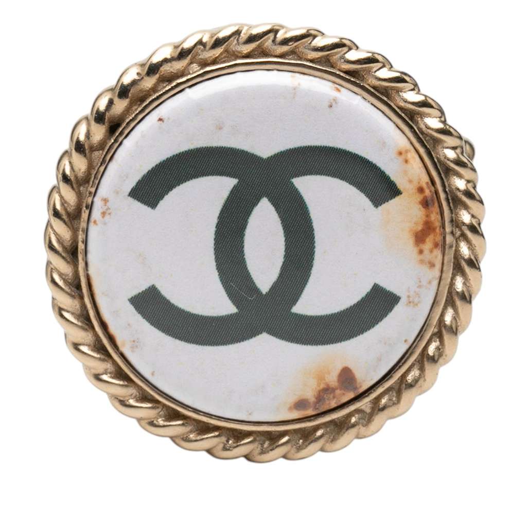 This brooch features a resin and gold-tone metal body and a back pin closure.