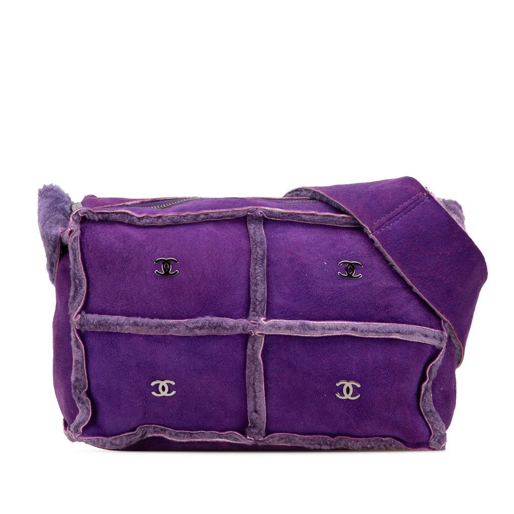 This shoulder bag features a suede body with fur trim, a flat shoulder strap, and a top zip closure.