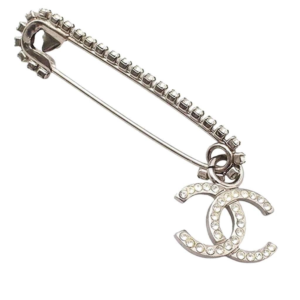 This brooch features a silver-tone metal body with crystal embellishments and a pin closure.