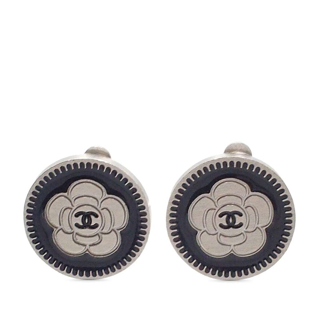 Chanel CC Silver Plated Enamel Camellia Clip On Earrings Sil
