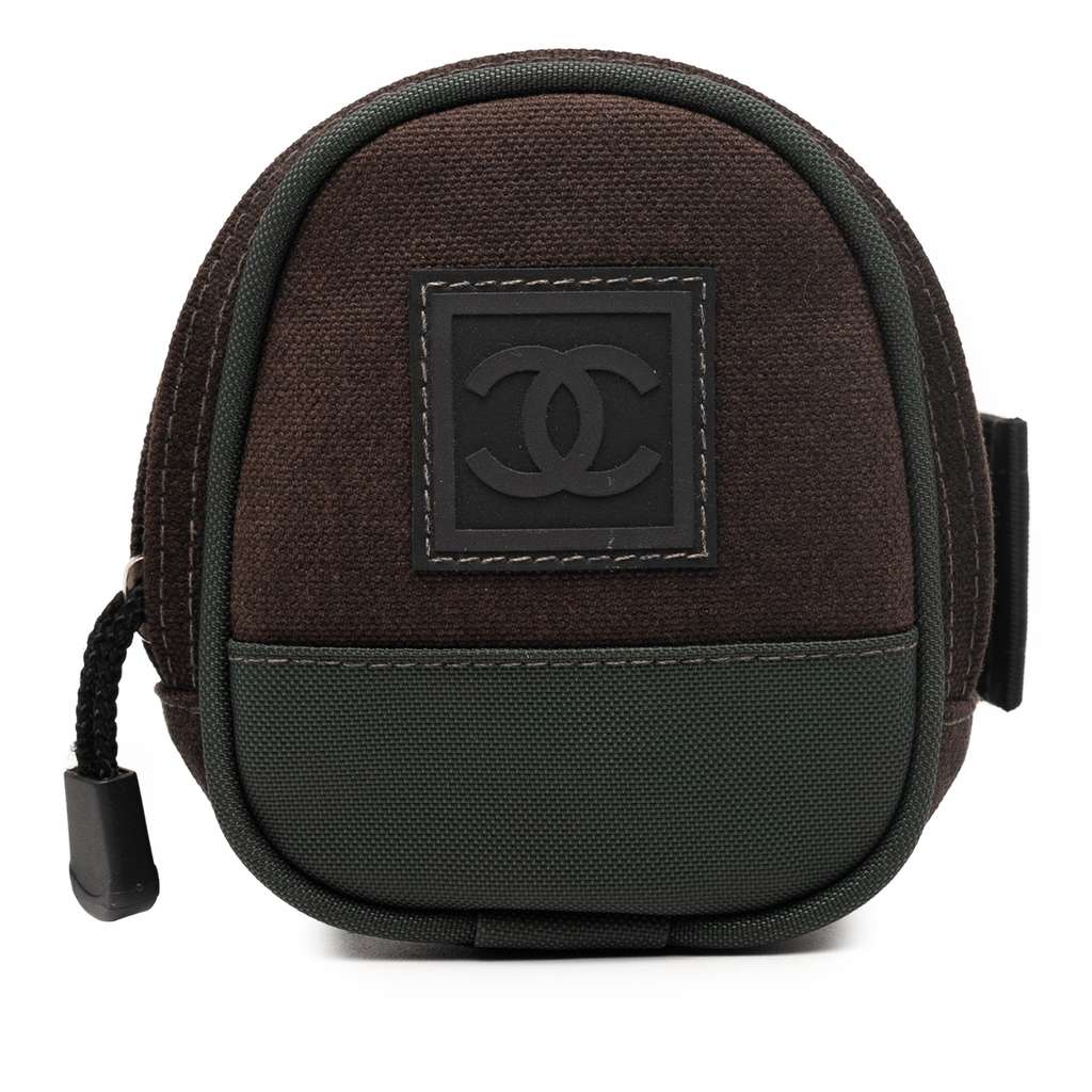 This pouch features a canvas and nylon body, an adjustable flat strap, a top zip closure, and an interior slip pocket.