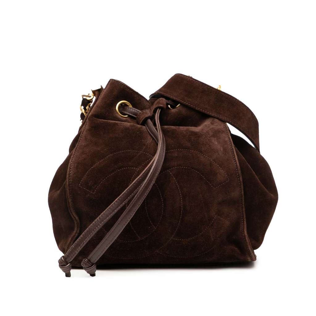 This bucket bag features a suede leather body, flat leather strap, an open top with drawstring closure, and an interior zip pouch.
