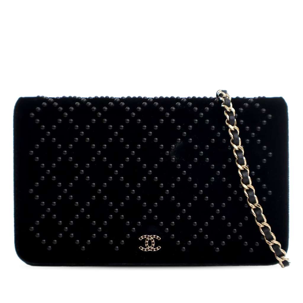 This wallet on chain features a velvet body with embellishments, a leather-woven chain link strap, a flap with snap button closure, an interior zip compartment, and interior slip pockets.